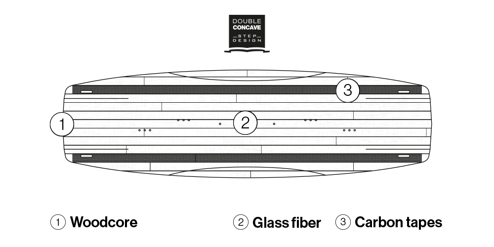 doppio concavo a V centrale, canali laterali e canali in punta. Migliora la presa e la fuoriuscita dell’acqua dalla tavola e favorisce la velocità e il controllo in acqua. Questi canali rompono anche la tensione superficiale dell’acqua, rendendo gli atterraggi più fluidi e gestibili, anche ad alta velocità. Questa tavola presenta anche una linea di rocker specifica con una sezione più piatta al centro per consentire una planata anticipata e con un rocker maggiore sulle punte per mantenere gli atterraggi facili e fluidi.