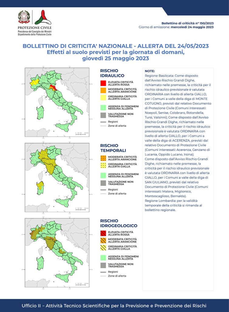 Ricordiamo che giovedì 25 maggio è prevista un’allerta rossa in Emilia-Romagna, un’allerta arancione in Emilia-Romagna e Piemonte e un’allerta gialla in sei regioni. L’allerta meteo-idro ti avvisa del possibile pericolo in cui potresti trovarti. Per conoscere le criticità previste per oggi e domani, consulta il bollettino nazionale di criticità e allerta.